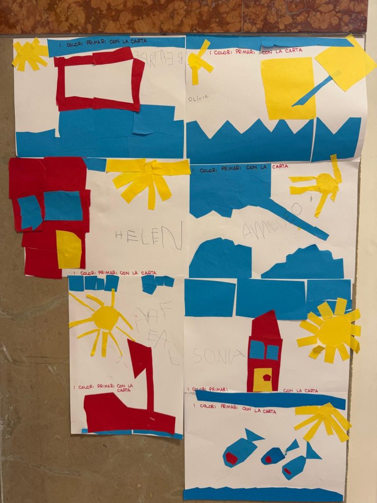 Il progetto ha preso avvio dall’esplorazione dei colori primari – rosso, giallo e blu – riconosciuti e nominati attraverso giochi visivi, conversazioni guidate e attività grafiche.