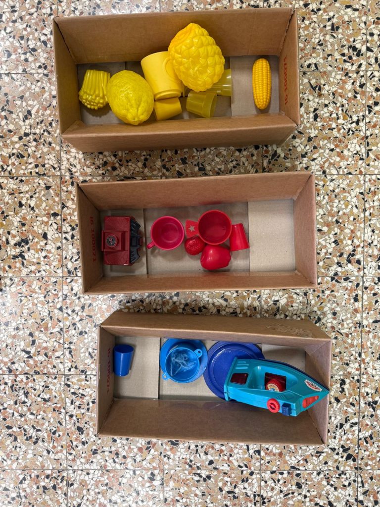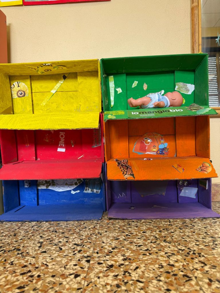 Alcune classi hanno lavorato sulla colorazione di scatole, trasformandole in contenitori tematici dedicati a ciascun colore. I bambini hanno dipinto le superfici utilizzando tempere e rulli, sperimentando la stesura del colore su materiali diversi e osservando le variazioni di intensità e coprenza.