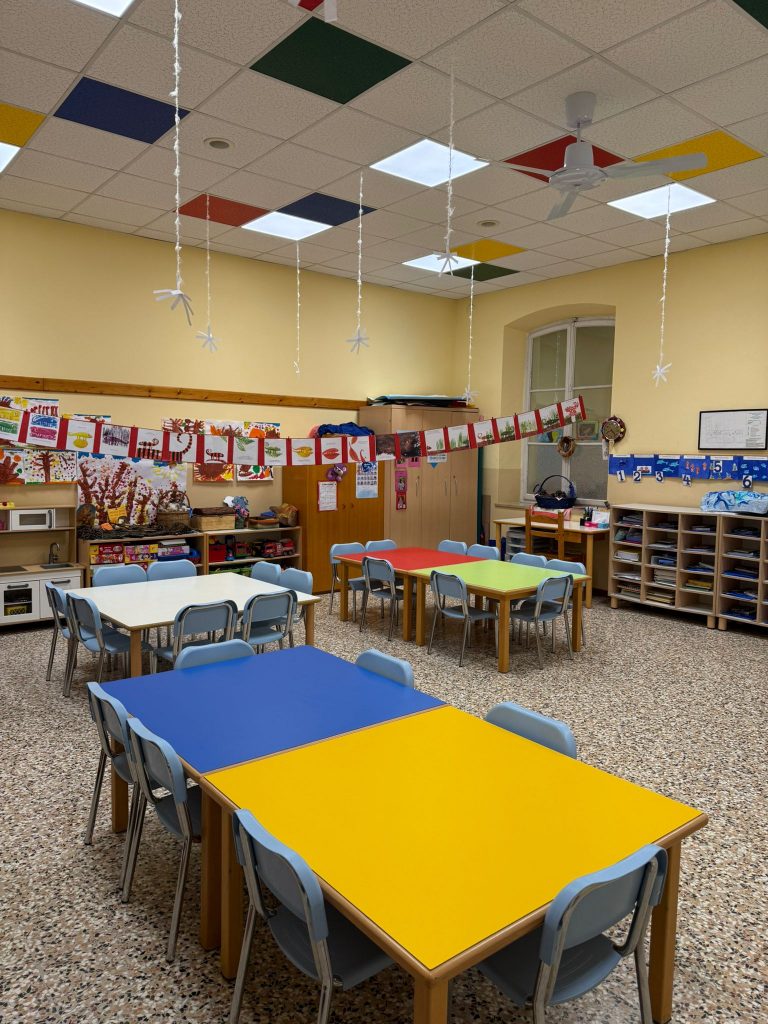 Nella scuola è presente un grande salone che consente lo svolgimento di varie attività, in particolare psicomotricità, svolta da una terapista esterna e si trasforma poi in dormitorio per le bambine e i bambini più piccoli che al pomeriggio riposano.